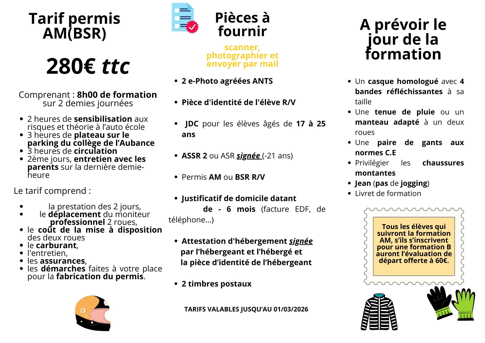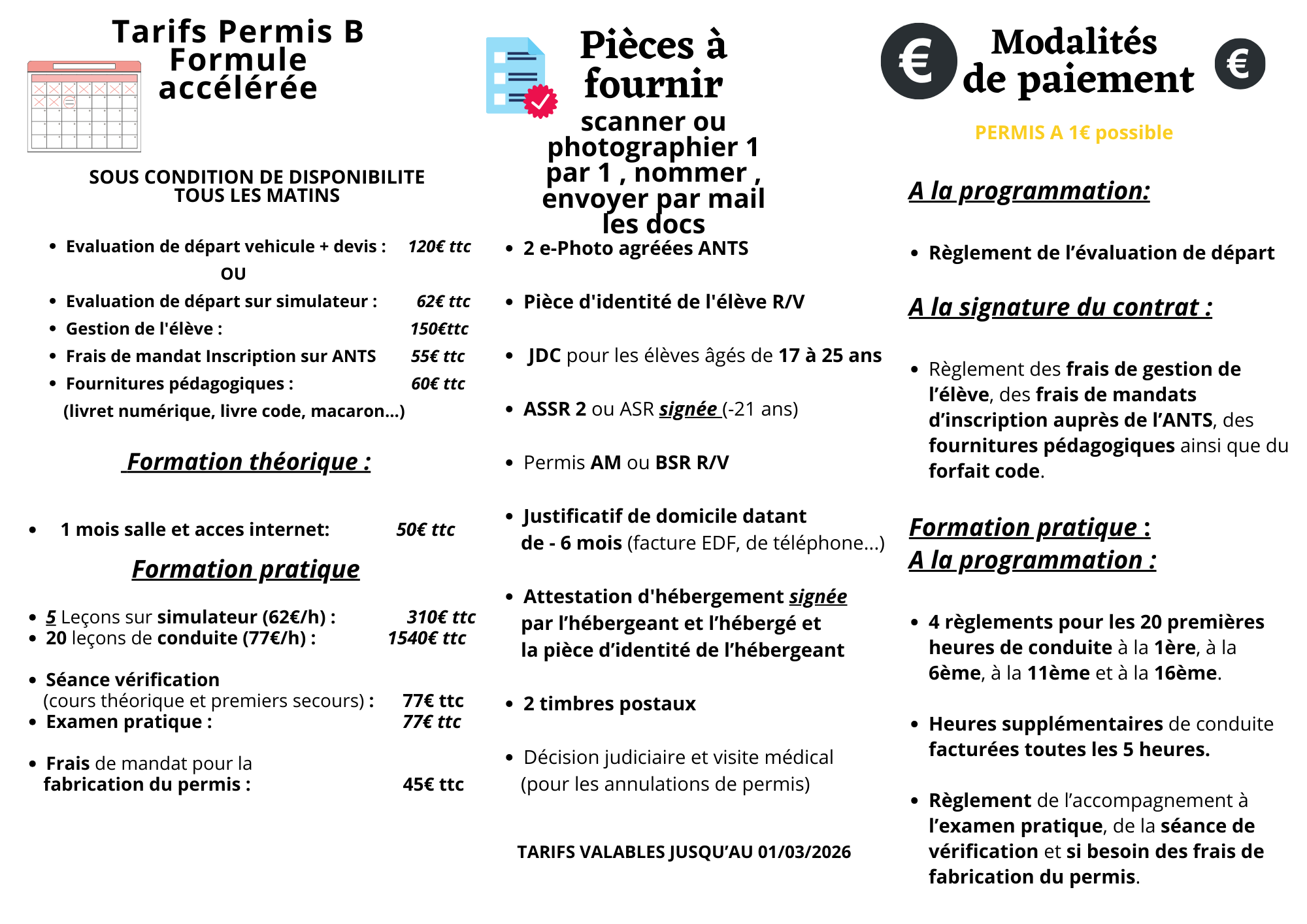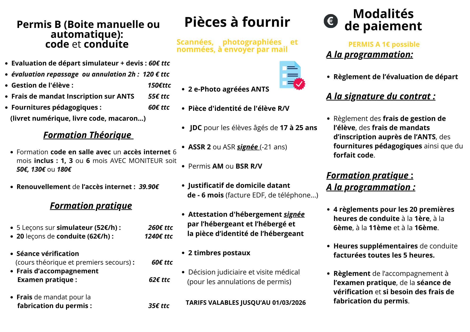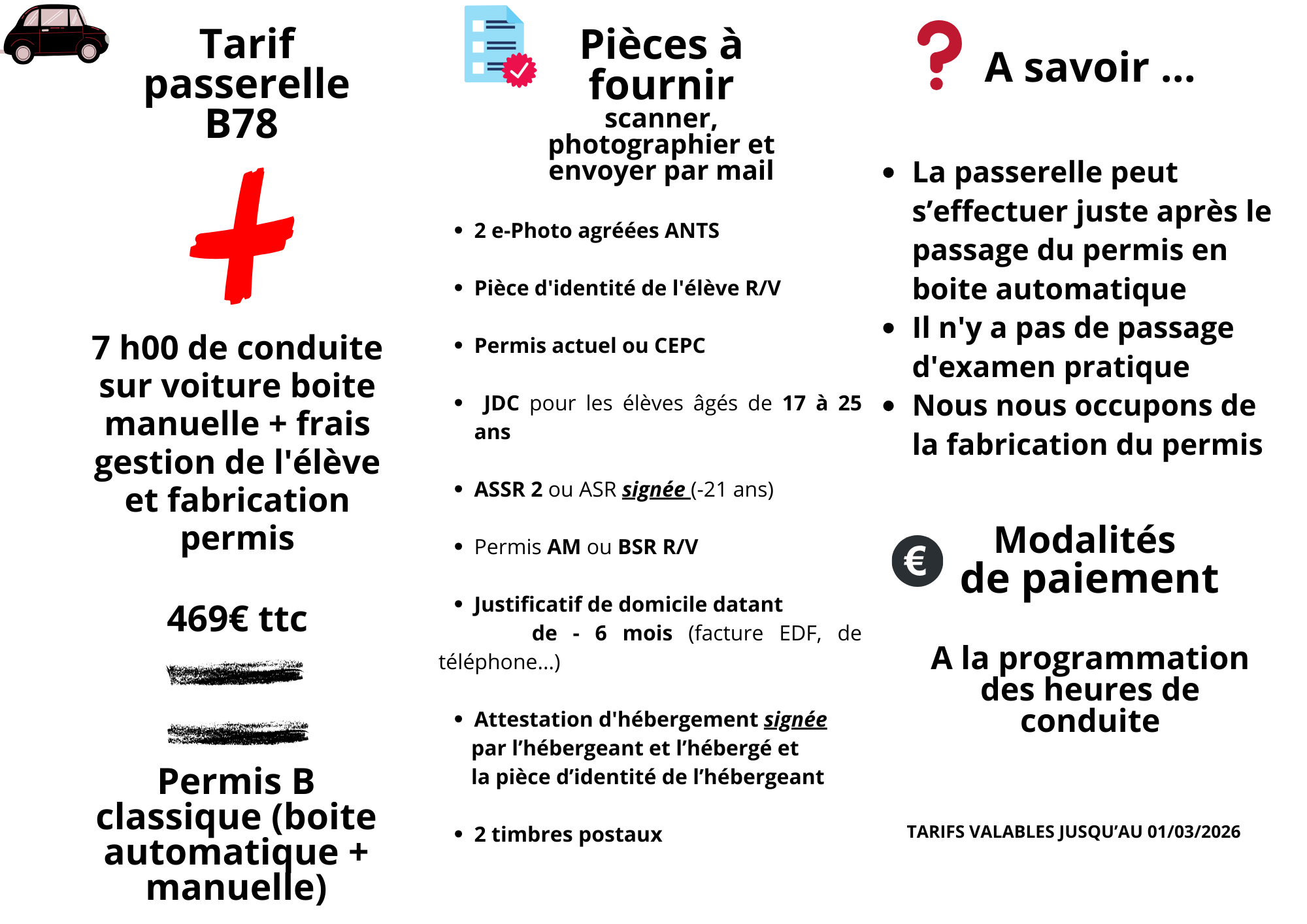 Nos tarifs Documents d'inscription ne s'affiche pas Permis B (Manuelle ou Automatique) Permis AM (BSR) Formation AAC ou Supervisée (Manuelle ou Automatique) PERMIS B Formule accélérée (Manuelle ou Automatique) Passerelle B78 469€